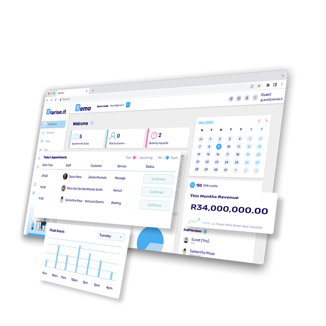 With built-in features like payment processing, customer messaging, and a detailed financial dashboard, Diarise.it helps you cut out the chaos, eliminate no-shows, and turn admin headaches into seamless, automated processes. It's the modern solution for service providers who want to elevate their brand, streamline operations, and scale up without stress.